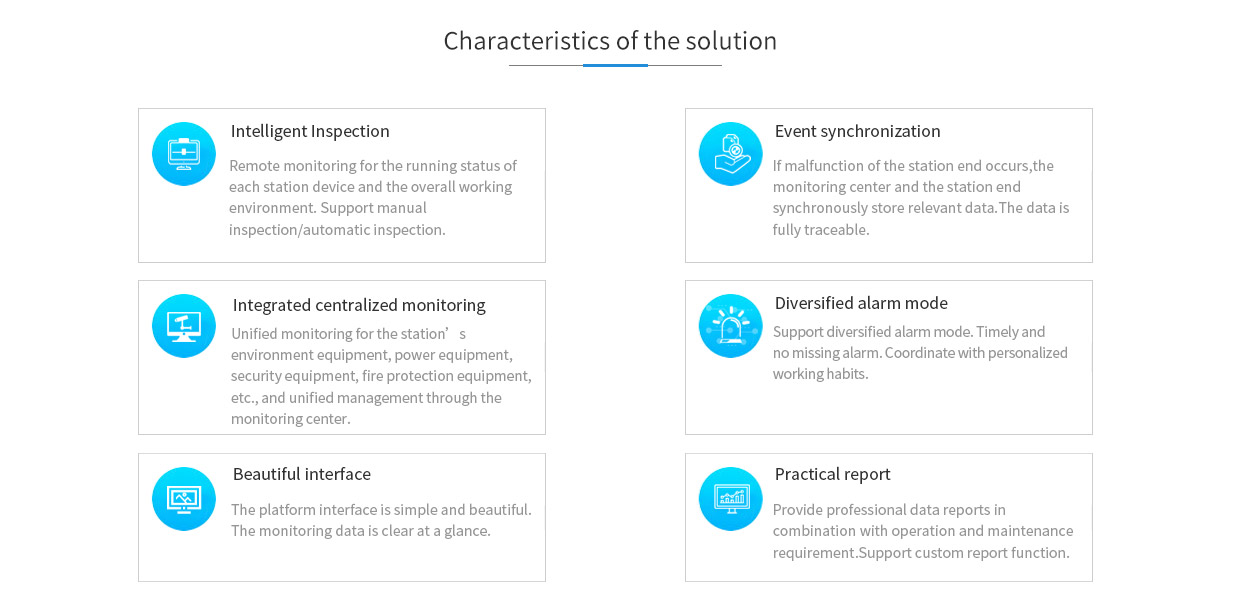 Unified monitoring for the station’s environment equipment, power equipment, security equipment, fire protection equipment, etc., and unified management through the monitoring center.