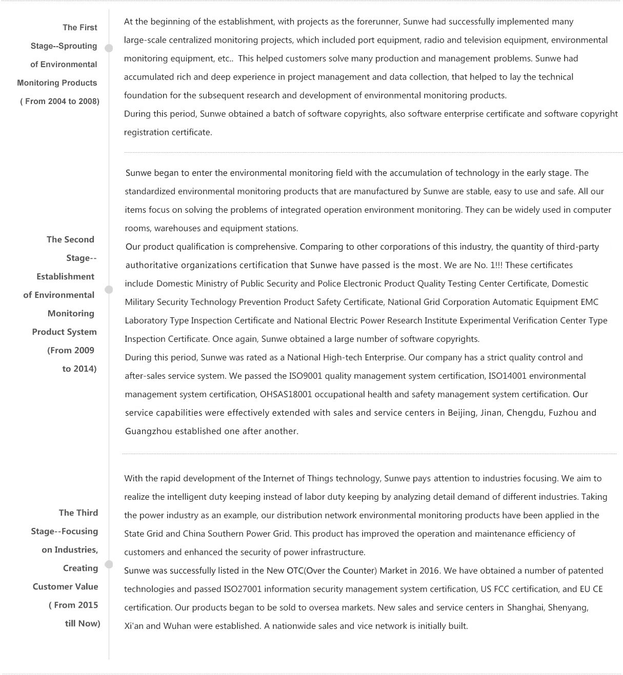 With the accumulation of technology in the early stage, Sunwe began to enter the environmental monitoringfield. The standardized environmental monitoring products that are manufactured by Sunwe are stable, easy to use and safe. All our items focus on solving the problems of integrated operation environment monitoring. They can be widely used in computer rooms, warehouses and equipment stations.